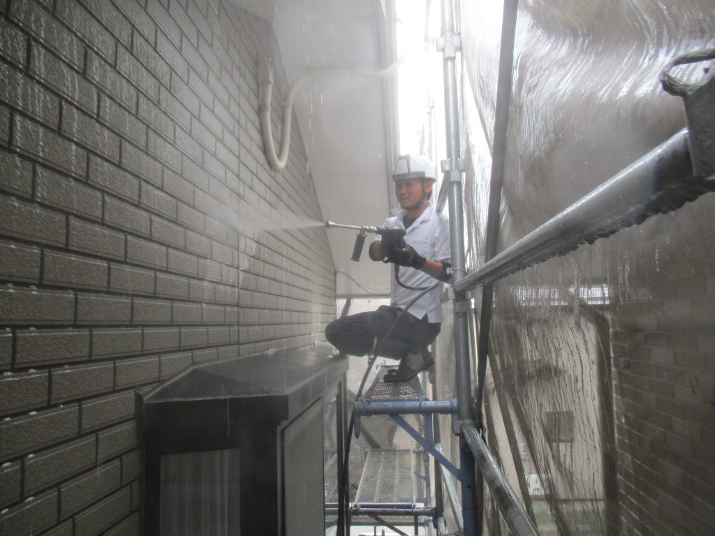 長年のあいだに蓄積されたホコリ、排気ガス、雨だれ汚れ、場合によってはカビやコケも見られるため、これらをきれいに洗い流すことで塗料の密着力をあげます。