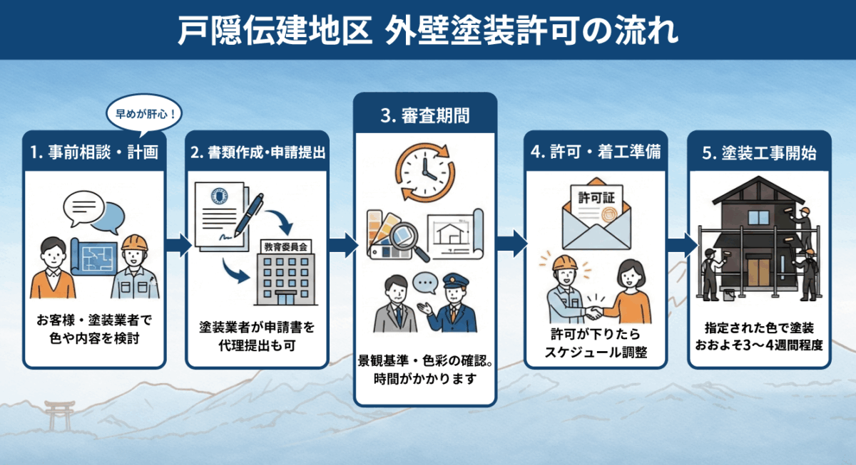 書類の審査から許可が下りるまで、数週間の期間を要する場合もあるため、「来週から塗りたい!」と思ってもすぐには着工できません。