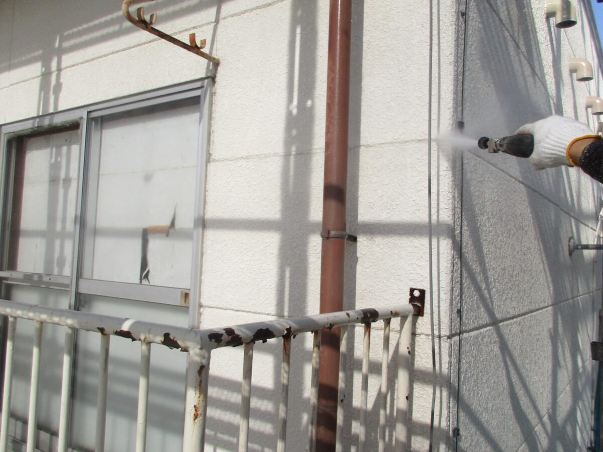 まずは汚れを綺麗にしていきます。劣化が進んでいるとひび割れやコーキングの切れから水が浸入してしまう恐れもあるので気を付けながら作業します。