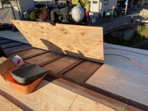 瓦棒葺き屋根はそのまま、その上へ縦ハゼ葺き屋根を被せるカバー工法での改修です。