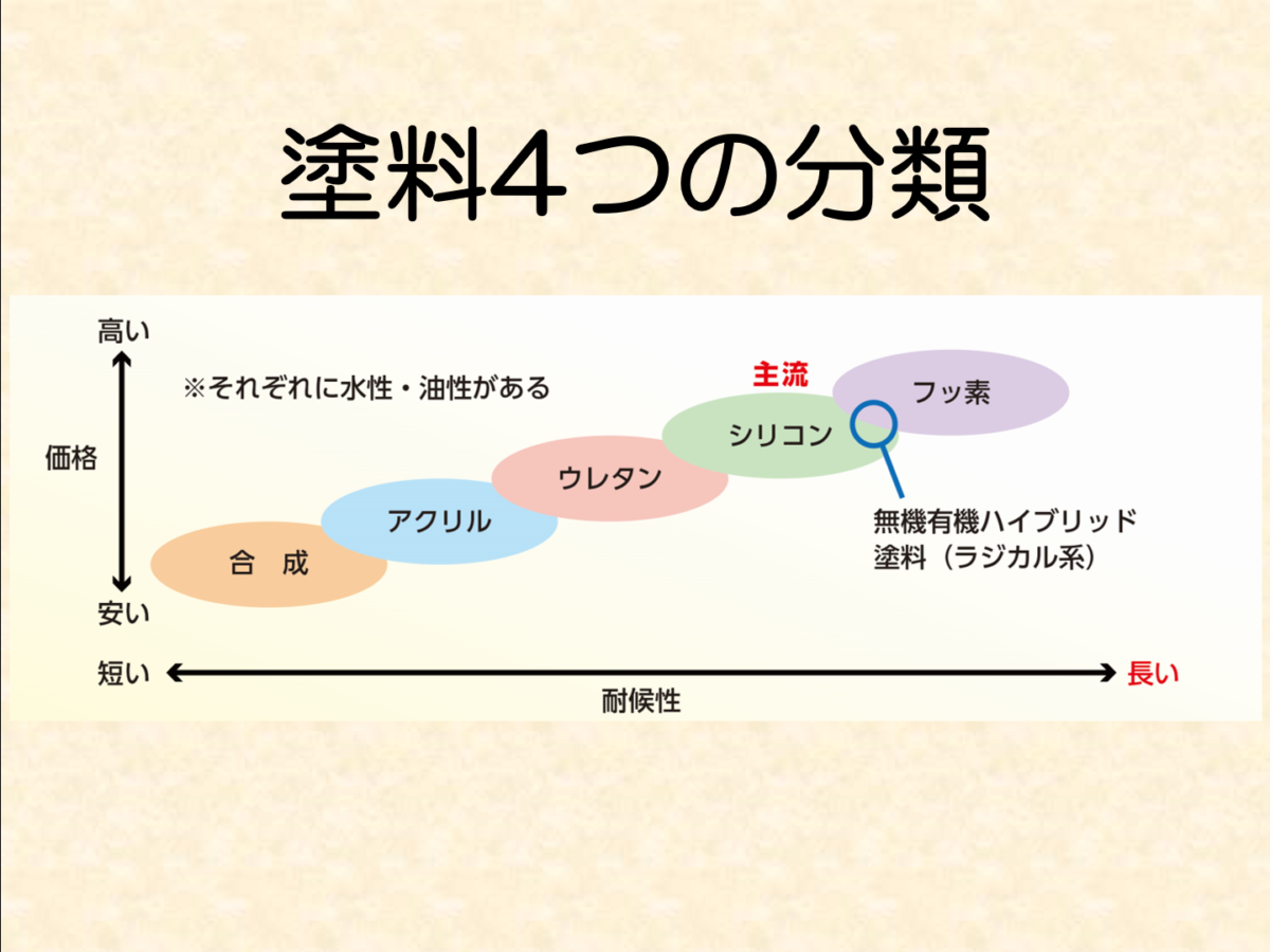 それぞれにメリットデメリットがありますので、この塗料はどの分類なの?どうしてこの塗料がいいの?