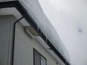 まず①で軒先に氷の塊ができます。これは部屋の上は暖房の使用などで温度が上がり雪が融けるのですが、軒先は温度が下がり凍り付きやすいです。