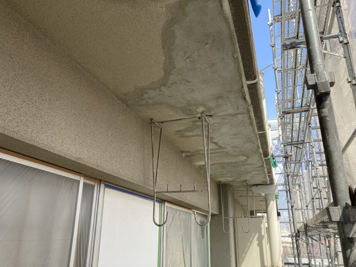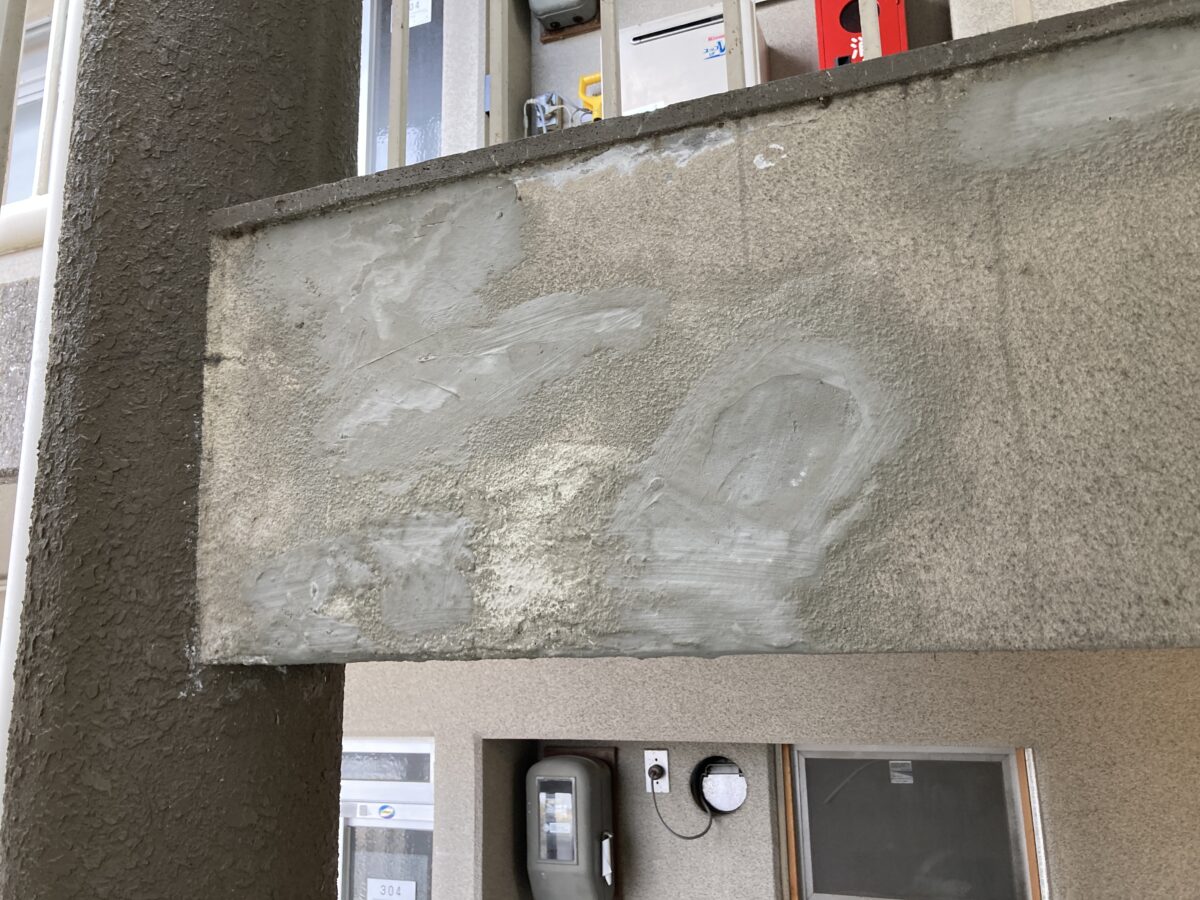 ひび割れやもろくなった外壁を補修材を用い修繕していきます。今回の建物は劣化がかなり進行しており、補修も通常より多かったです。