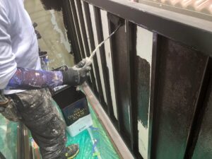 洗浄の作業で外壁と水洗いして乾燥させたら、鉄部の下塗り作業錆止め【下塗り】を行いました。