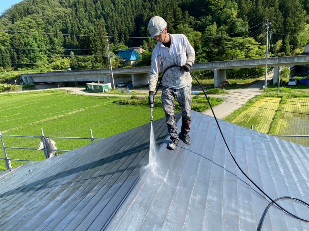 ケレン後、ケレンで落とした錆やコケ汚れなどを、高圧洗浄機を用いて落としていきます。