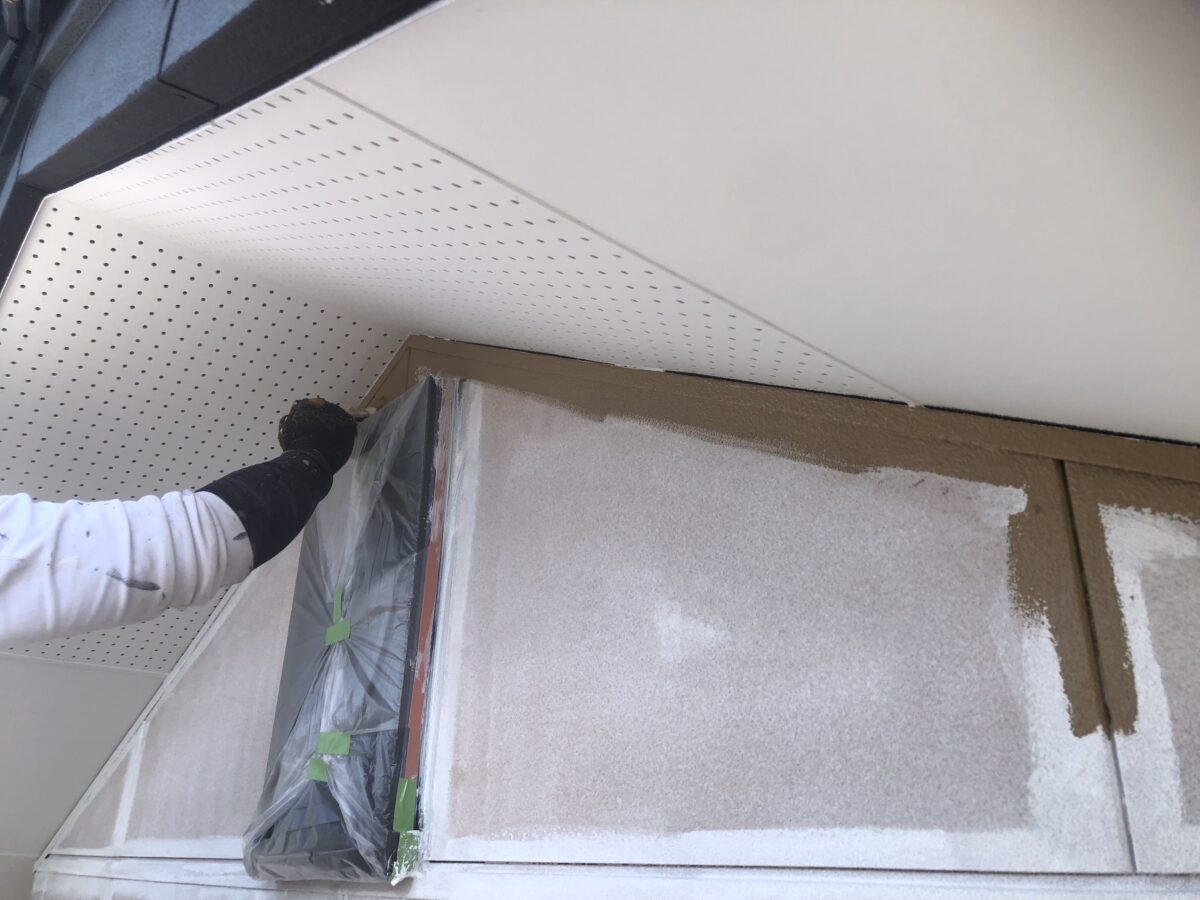 補修が終了したら、いよいよ塗装作業を行います。最初は、下塗りという下地と塗料の密着性を良くするノリのような役割があります。また、鉄部と外壁で使用する下塗り剤は異なります。壁で使用した塗料は水性ミラクシーラーエコという塗料で、耐水性・防藻機能に優れています。鉄部で使用した塗料は、ザウルスEXという速乾性があり、優れた耐久性があります。