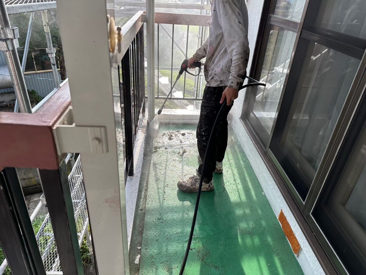 高圧洗浄でケレンで出た汚れやサビ、ゴミなどを洗い流していきます。