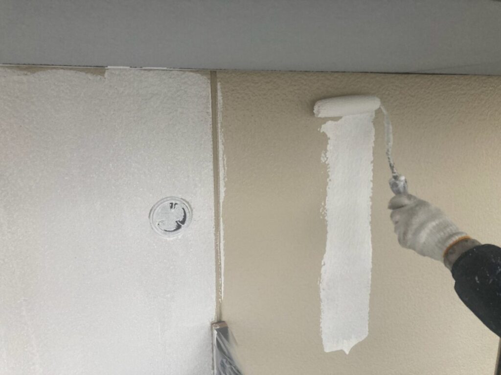 洗浄が終わり次第、塗装の作業に入ります。塗装の工程は、全部で三回あります。下塗り→中塗り→上塗りという流れになっています。何が違うのかご紹介いたします。下塗りは、下地と塗料の密着性を良くする際に使用されるノリのような役割があります。