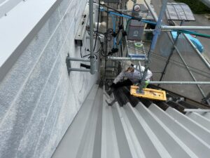 最初に行った作業は、ケレンという錆びている所を磨いて下地と塗料の密着を良くする作業です。ケレンは、大変重要な作業でケレンを怠ると塗膜の耐久性が悪くなり建物全体の耐久性と格段に悪くなります。また屋根をケレンする際にグランダーという電動工具を使用します。