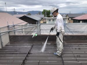 洗浄が終わり次第に、下塗りを行います。下塗りは、下地と塗料の密着性を良くするノリのような役割があります。屋根に使用する下塗り材は錆止めという鉄部の錆を抑える効果があります。壁の下塗り材は、防カビ防藻に優れた塗料を使用します。