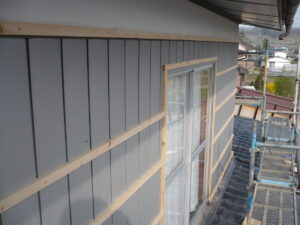 まず、新しい壁材をしっかりと固定するための下地材である「胴縁(どうぶち)」を取り付けていきます。