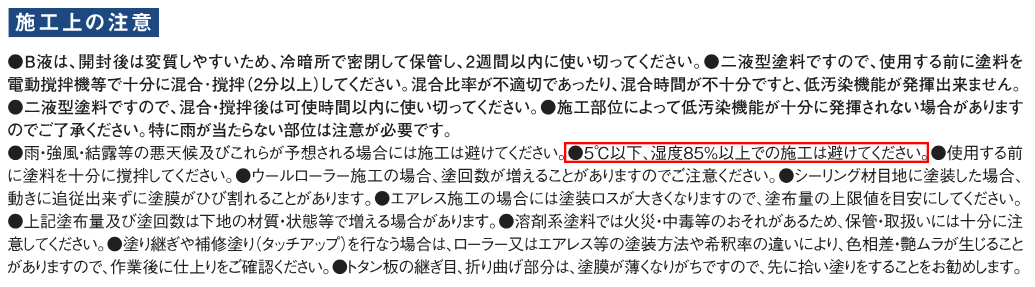 ただし、気温5℃以下、湿度85%以上の環境では塗装を避けるという「施工基準」があります。