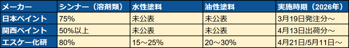 大手塗料メーカーにより発表されている値上げ率は以下の通りです。※4/17時点
