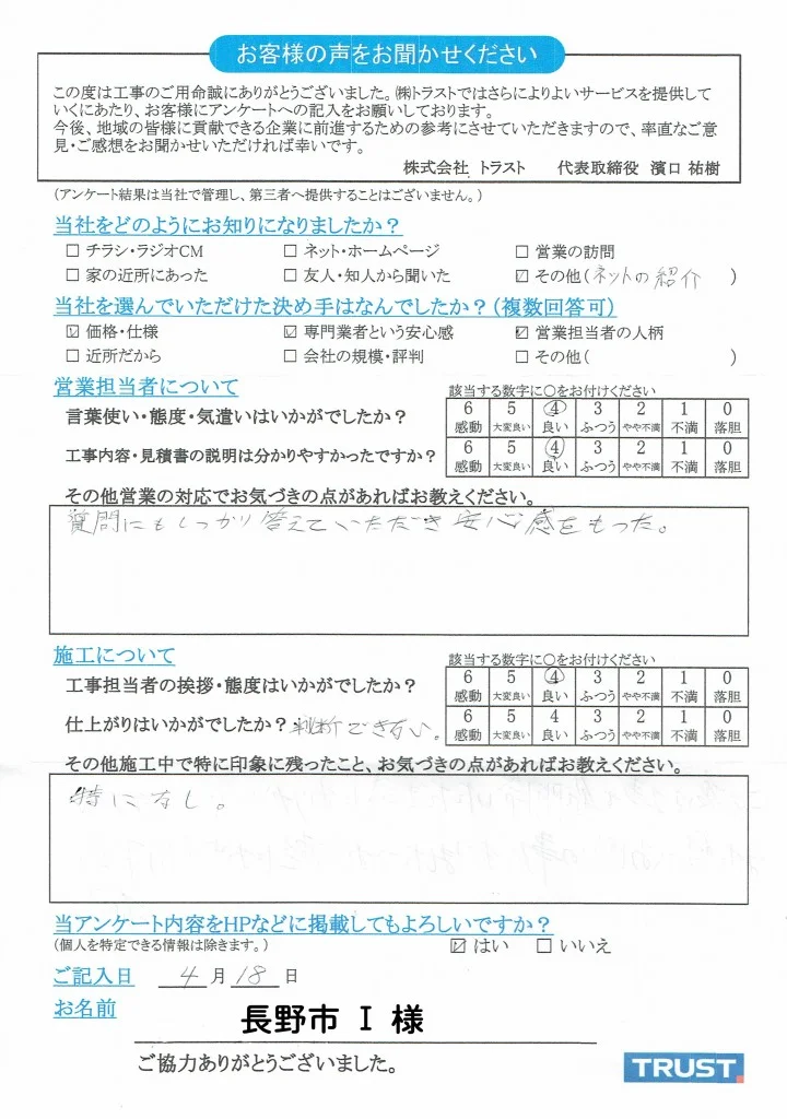 HOME > お客様の声 口コミ・評判 > 長野市I様