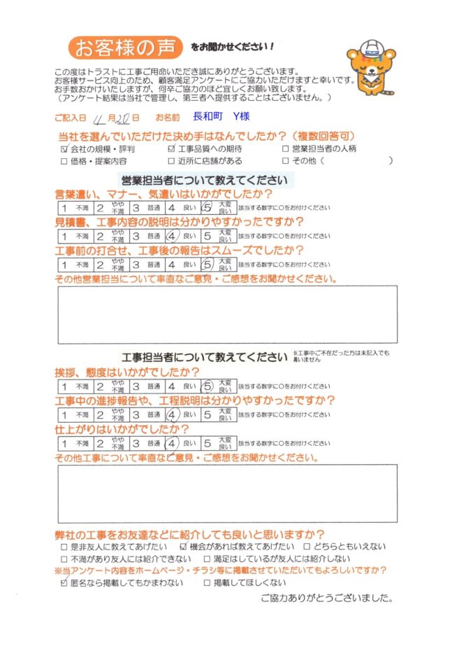 HOME > お客様の声 口コミ・評判 > 長和町 Y様