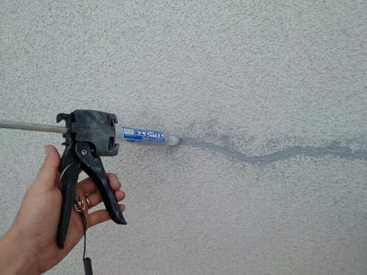 外壁は数か所ひび割れが見受けられました。細いひび割れでしたので”圧入工法”と言われる補修方法でひび割れを直していきます。