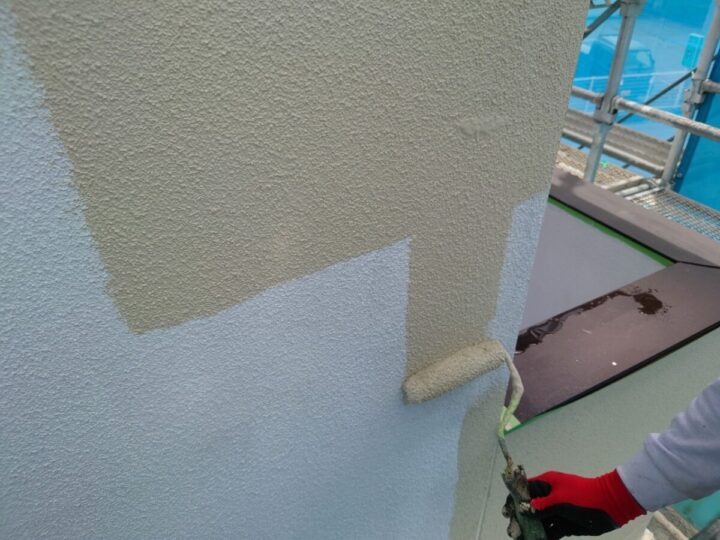 外壁も下塗り塗装後、上塗りを行います。