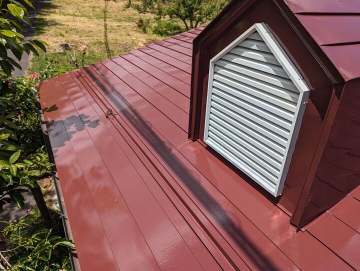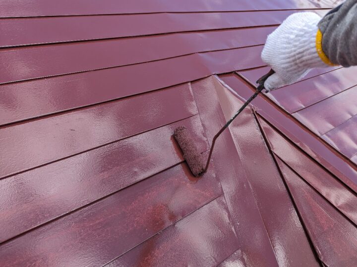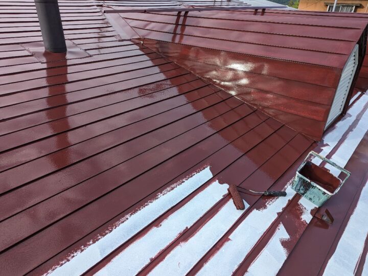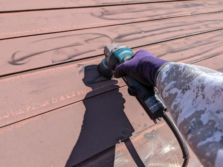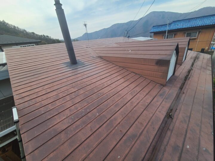 屋根の現状としましては、塗料の剥がれ、一部にサビが出ていました。丁寧に研磨を行い、洗浄後、遮熱性に優れた塗料で塗装致しました。アンテナマストも併せて施工致しました。