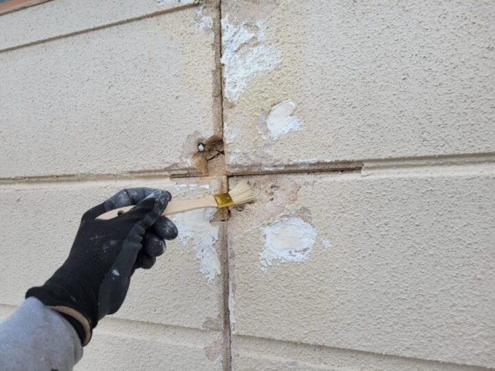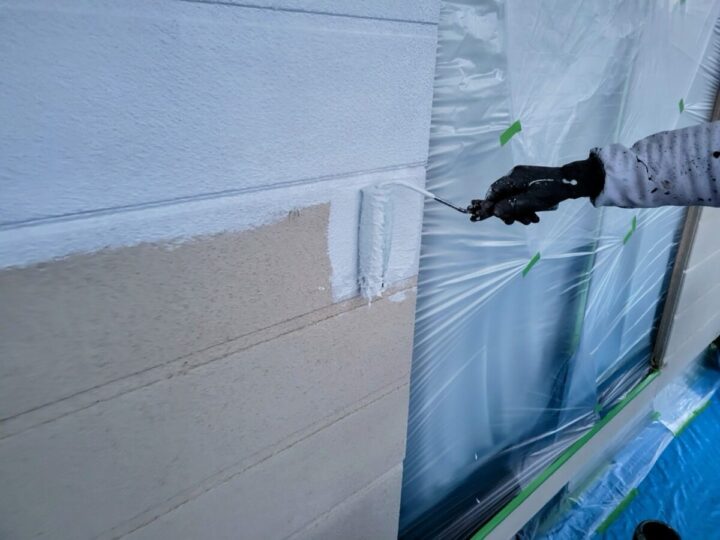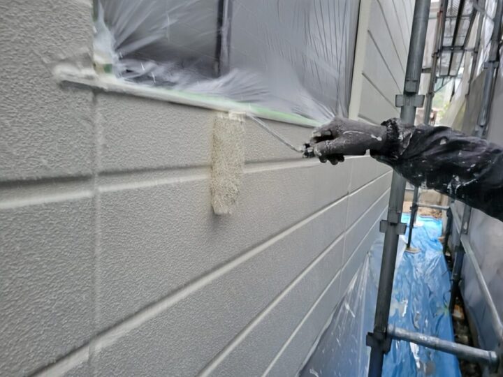 塗料の密着力を高める為、しっかりと下塗りをします。外壁上塗り(1回目)