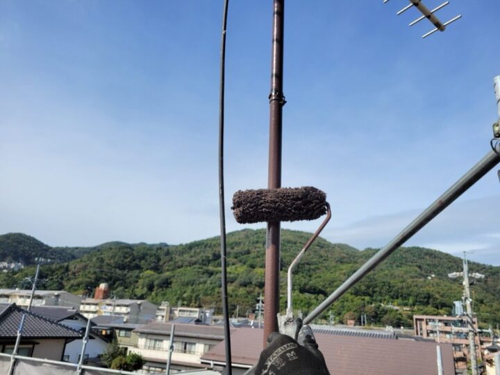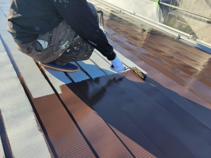 下塗りをした後、刷毛やローラーを使用し塗り残しがないよう丁寧に塗装します。屋根上塗り(2回目)