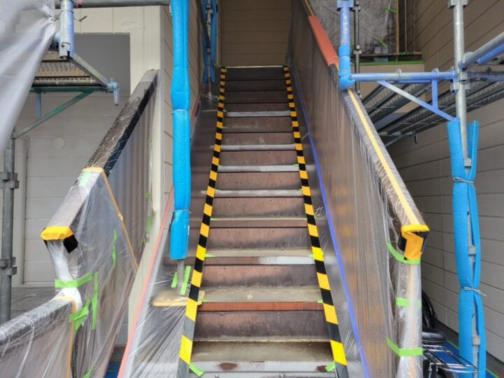 塗料の密着性を高めるため、表面に細かなキズをつけていきます。高圧洗浄