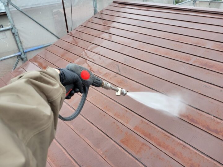 業務用の高圧洗浄機を使用して、汚れやごみを洗い流します。屋根下塗り