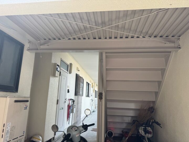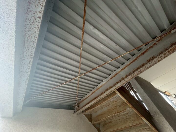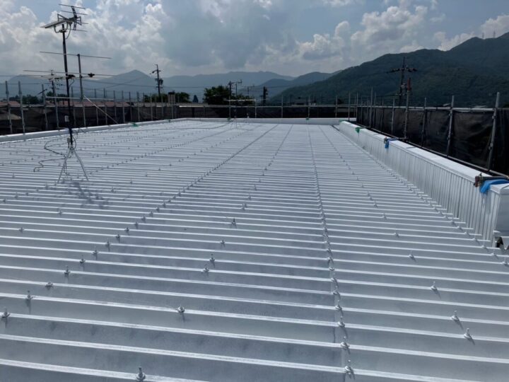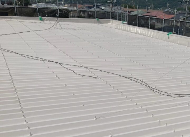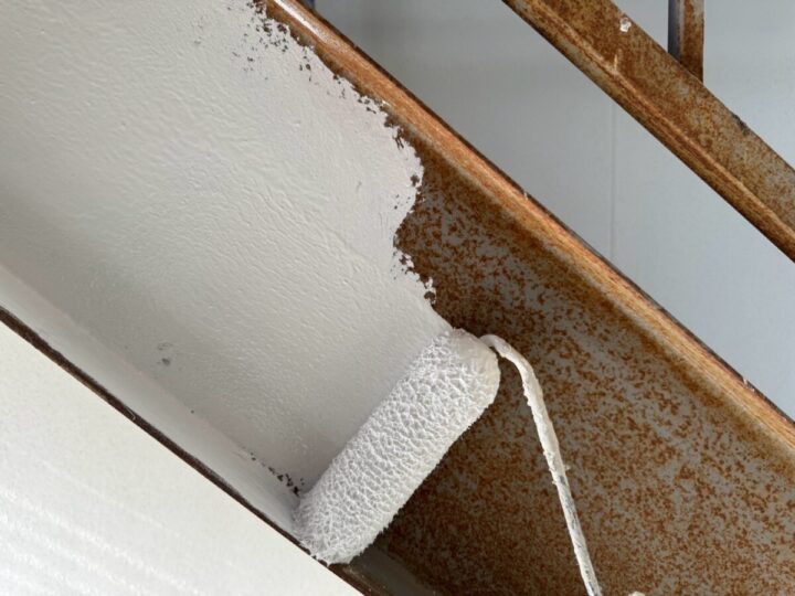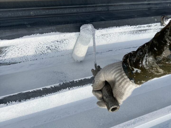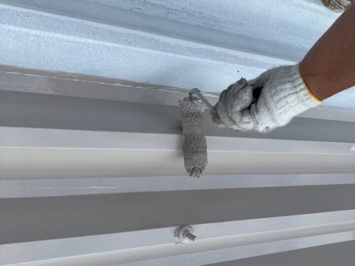 塗り残しがないよう刷毛とローラーを使っていきます。サビ止め、密着力の向上などの効果があります。屋根上塗り