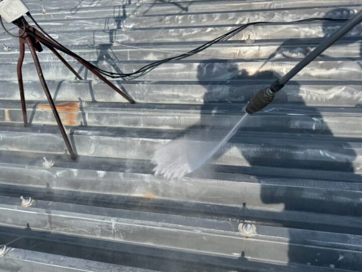 業務用の高圧洗浄機を使用して汚れやごみをきれいに洗い流します。屋根下塗り