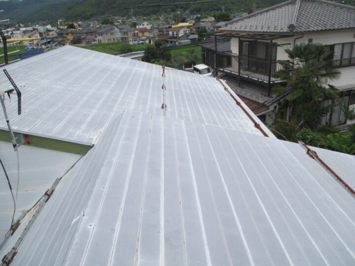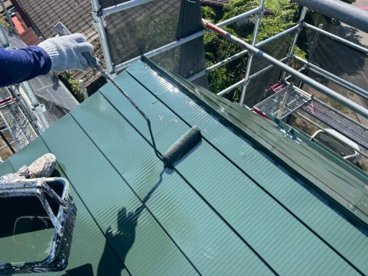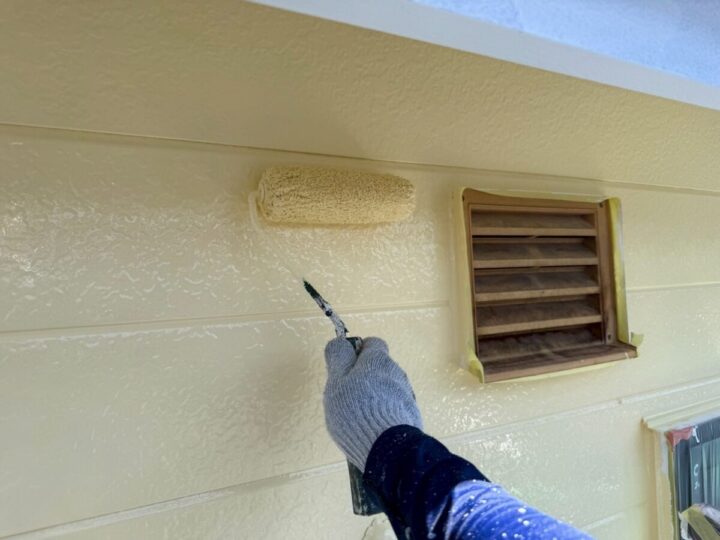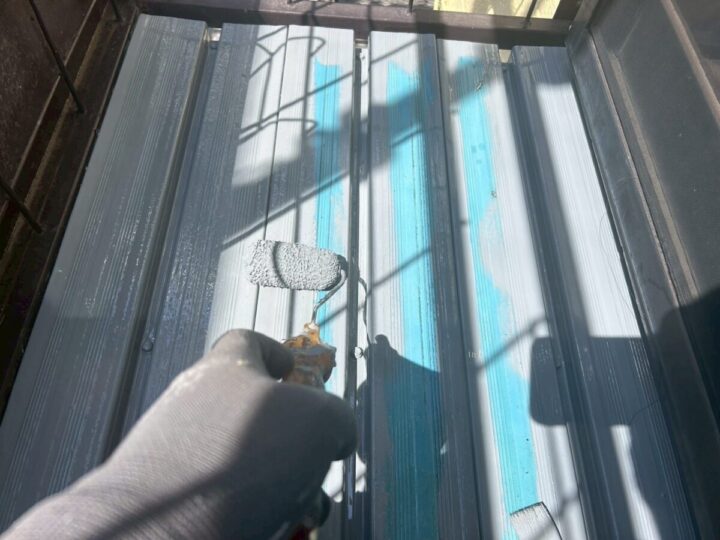 塗り残しがないよう刷毛とローラーを使っていきます。サビ止め、密着力の向上などの効果があります。外壁塗装