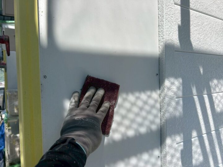 塗料の密着性を高めるため、表面に細かなキズを付けていきます。高圧洗浄
