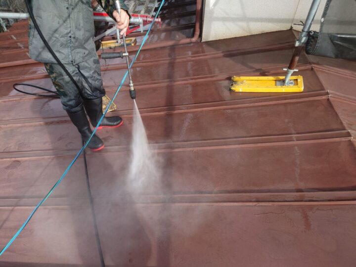 業務用の高圧洗浄機を使用して、汚れやごみを洗い流します。