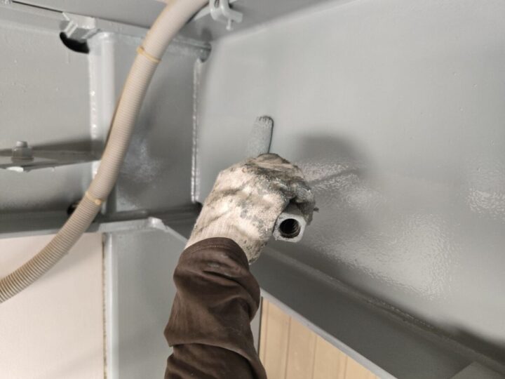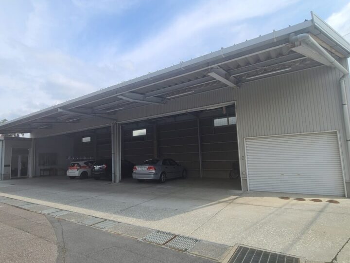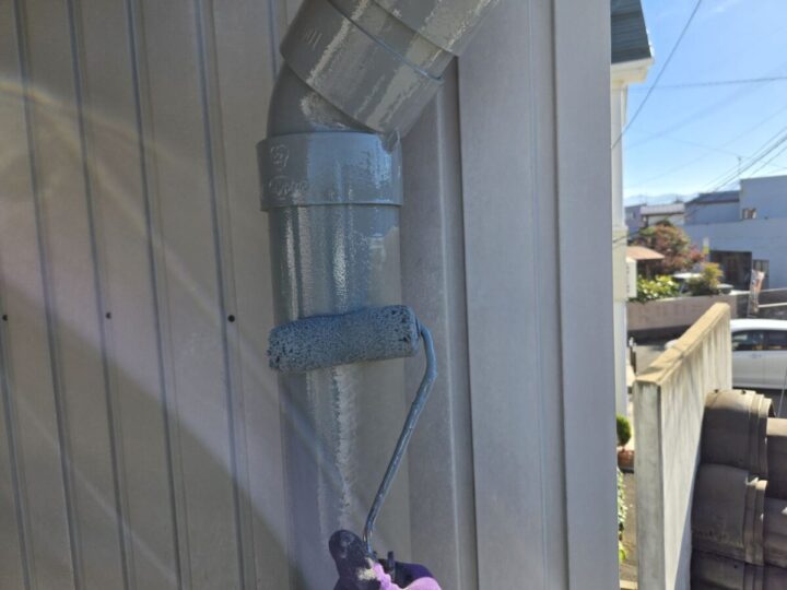 車庫の鉄骨部の塗装依頼とのことでした。現状としましては赤さびが出ている箇所が見られ、雨樋に退色が確認出来ました。