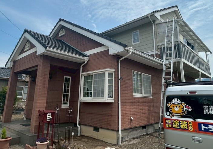 2階部分は通常塗装で下塗り1回上塗り2回の計3回塗りを行います。付帯部塗装