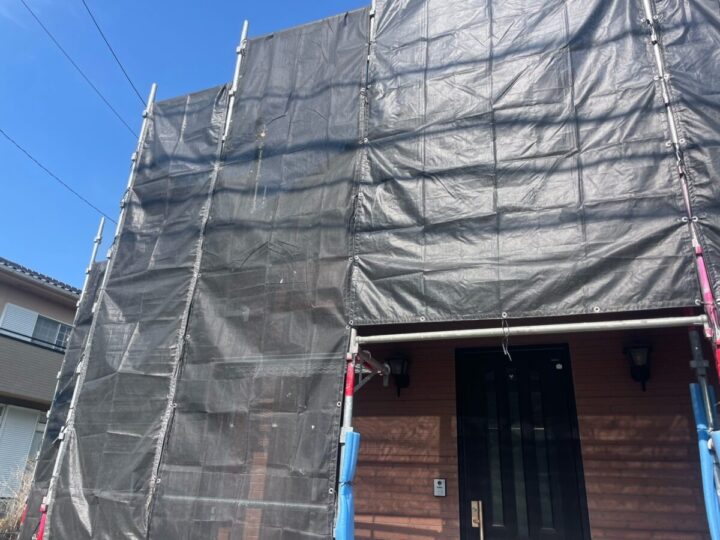近隣の皆様へ配慮させて頂きながら足場を立て、飛散防止のためにメッシュシートをつけます。ケレン処理(研磨)