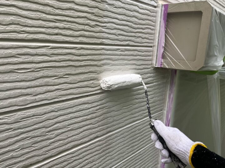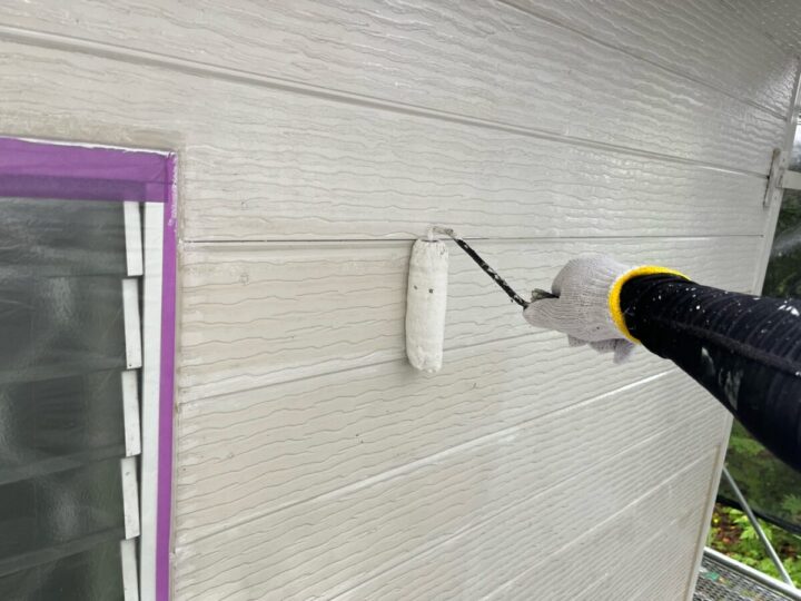 下地の種類、状態にあわせた材料で下塗りを行います。下地を強化することが目的です。外壁上塗り