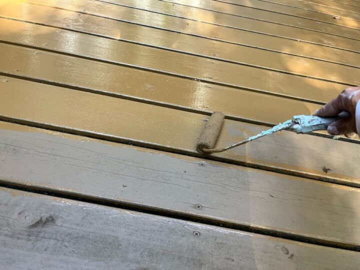 塗料の性能を十分に発揮できる膜厚にするため、上塗りは2回行います。付帯部木部デッキ塗装