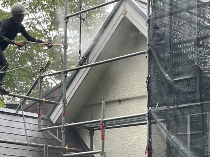 近隣の皆様へ配慮させて頂きながら足場を立て、飛散防止のためにメッシュシートをつけます。高圧洗浄