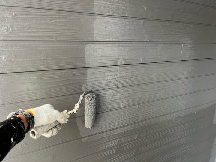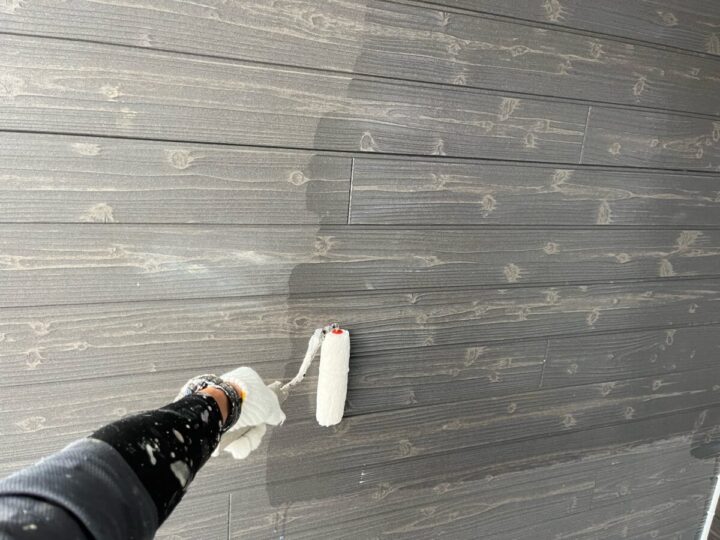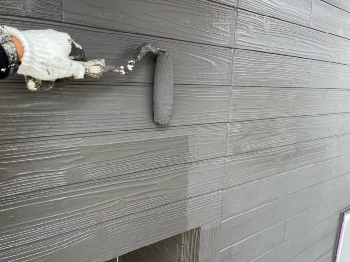 塗料の密着力を高める為、しっかりと下塗りをします。外壁上塗り(1回目)