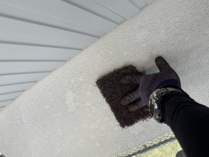 塗料の密着性を高めるため、表面に細かなキズをつけていきます。高圧洗浄