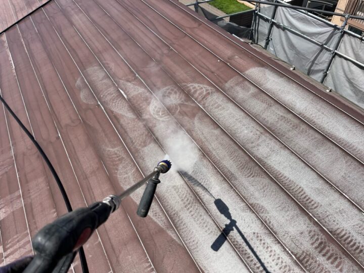 業務用の高圧洗浄機を使用して、汚れやごみを洗い流します。屋根下塗り