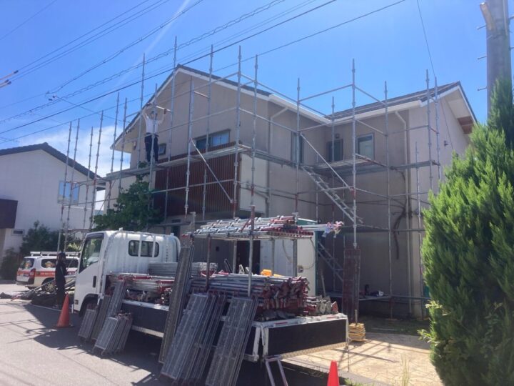 近隣の皆様へ配慮させていただきながら足場を立て、飛散防止のためにメッシュシートを付けます。高圧洗浄