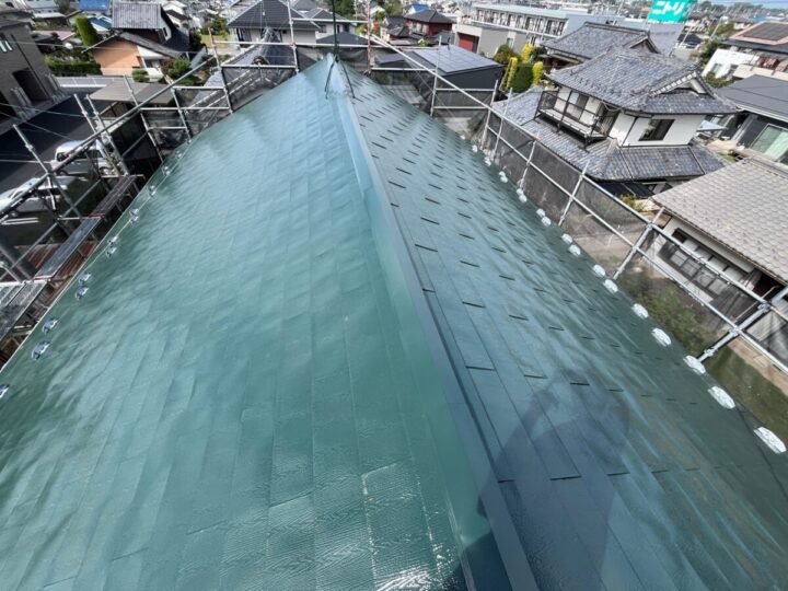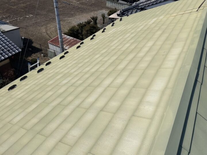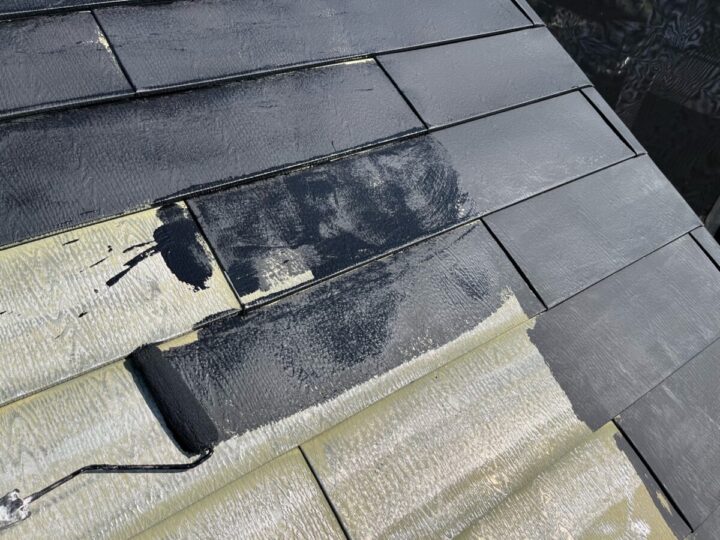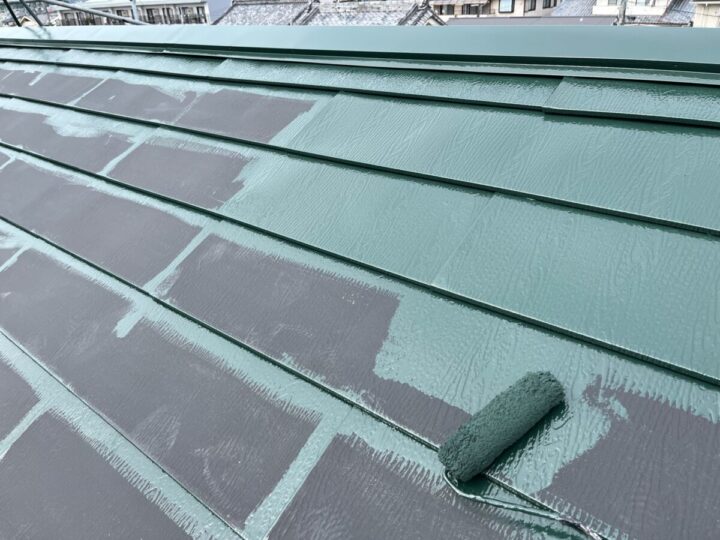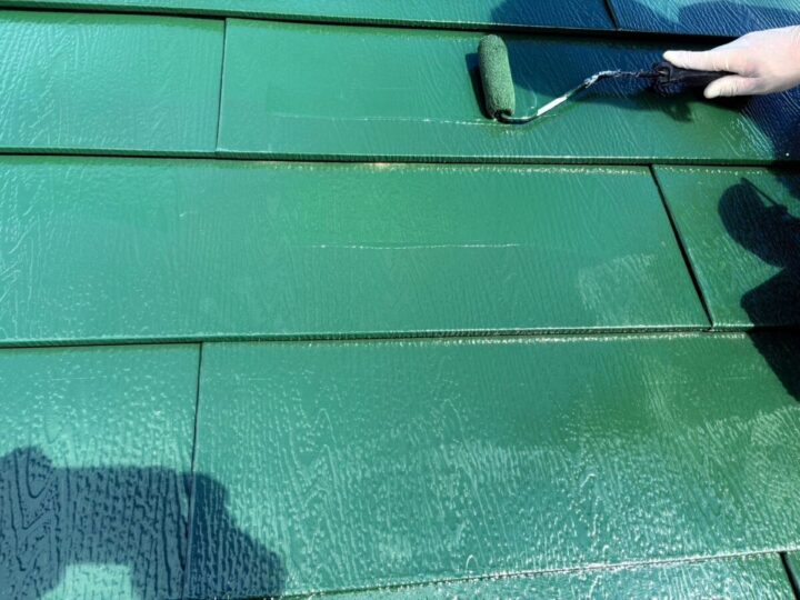 下塗りをした後、刷毛やローラーを使用し塗り残しがないよう丁寧に塗装します。屋根上塗り(2回目)