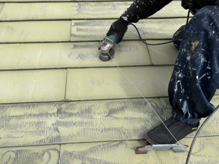 塗料の密着性を高めるため、表面に細かなキズをつけていきます。高圧洗浄