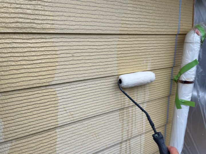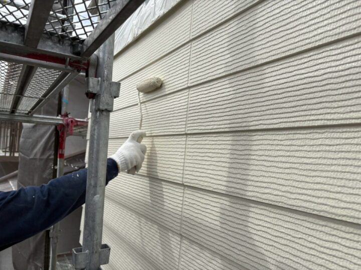 塗料の密着力を高める為、しっかりと下塗りをします。外壁上塗り(1回目)