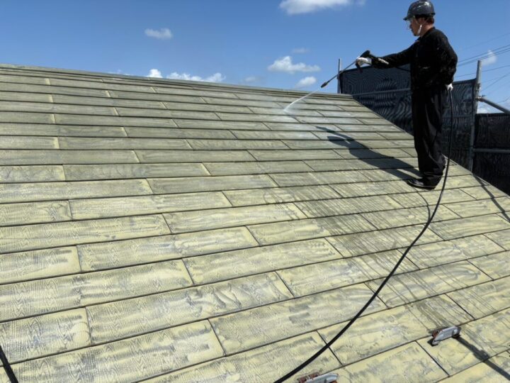 業務用の高圧洗浄機を使用して、汚れやごみを洗い流します。屋根下塗り