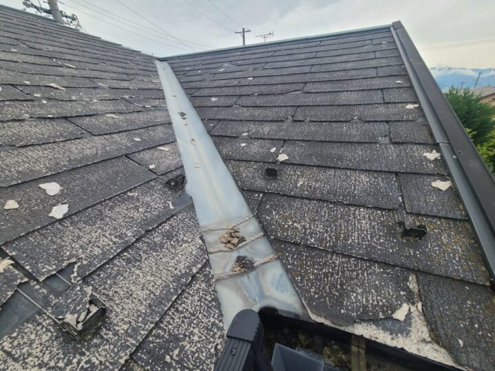 屋根は経年劣化により、塗膜が剥がれ、屋根材が崩れ落ちているのが確認出来ました。雨樋にも崩れたものが入っており、雨水の流れを塞いでしまう状況で、貼り替えが必要な状態でした。外壁でも塗膜の力が弱くなってきており、コーキング材の劣化もある為、防水機能の低下が見受けられました。