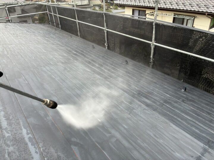 業務用の高圧洗浄機を使用して、汚れやごみを洗い流します。