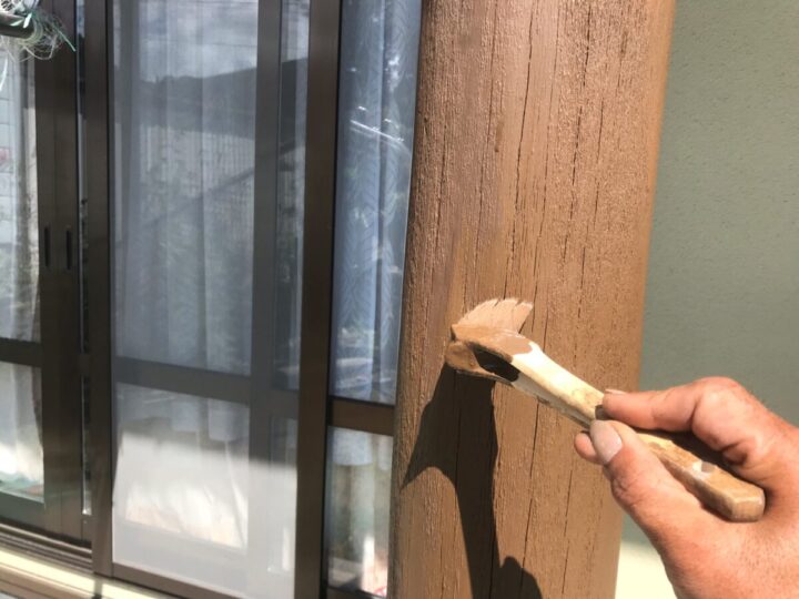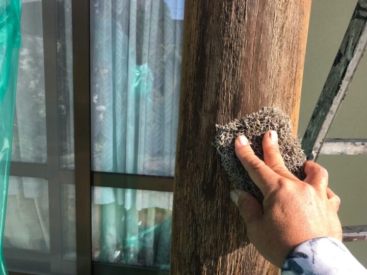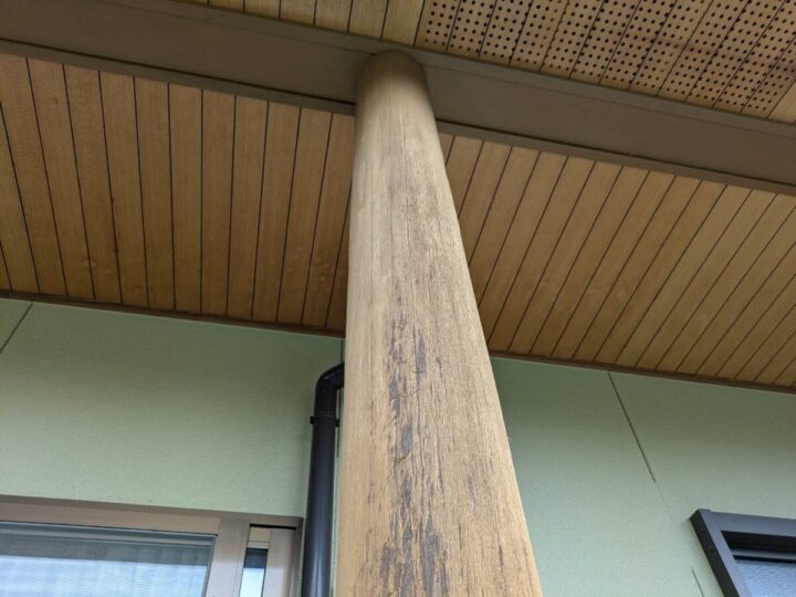玄関の木部の柱の塗装をご希望とのことで、木部用の塗料を使用して塗装致しました。塗る前にはあった黒ずみが無くなったことでお家の顔である玄関がすっきりと綺麗に見える仕上がりました。