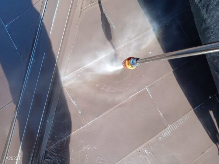 業務用の高圧洗浄機を使用して、汚れやごみを洗い流します。