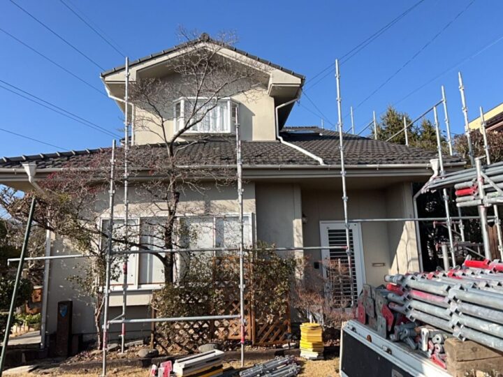 近隣の皆様へ配慮させて頂きながら足場を立て、飛散防止のためにメッシュシートをつけます。
